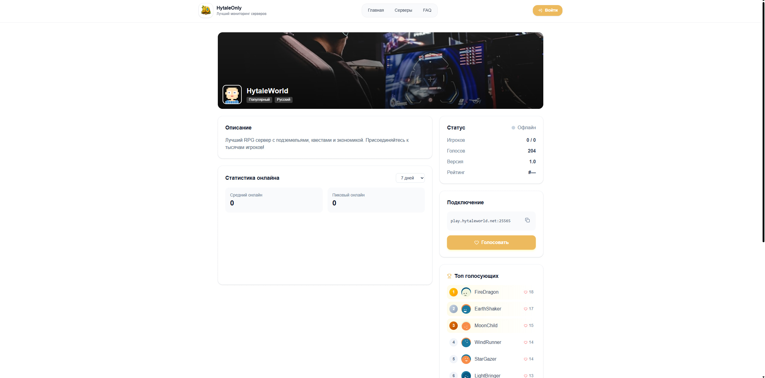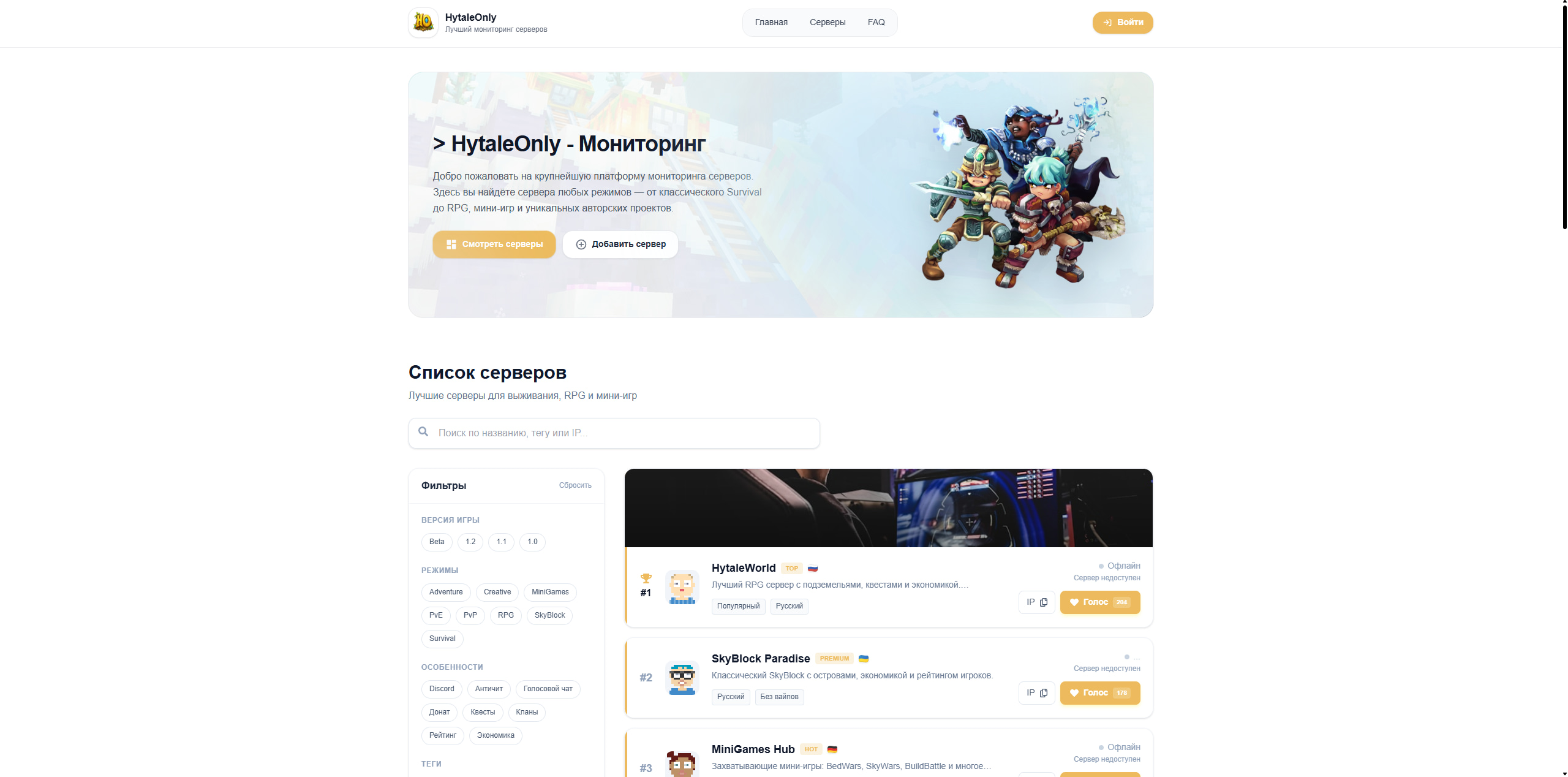 Сайт для мониторинга серверов HYTALE. (админ панель, авторизация, оптимизация для крупных запросов, система рейтинга, личный кабинет, управление серверами)